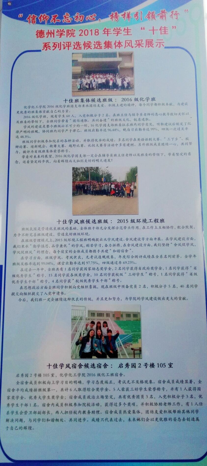 (记者:李慧婧)在学风建设月中,为了突出主题,使同学们有目标、有榜样参照,2018年5月18日,化学化工学院学科部举办了“十佳系列评选”活动以及我院“学习标兵评选”活动。 此次评选征集各班学习标兵的学习思想、学习目标、学习感受,并再附上他们的照片,以展板的形式置放在5楼展示出来,供同学们学习。 此次活动意义重大。通过该活动,给同学们树立了榜样,充分发挥了每个班级优秀学生的带头作用,彰显了化学化工学院的同学们在学风建设月期间,积极完成我院的要求,展现大学生的神采和精神。